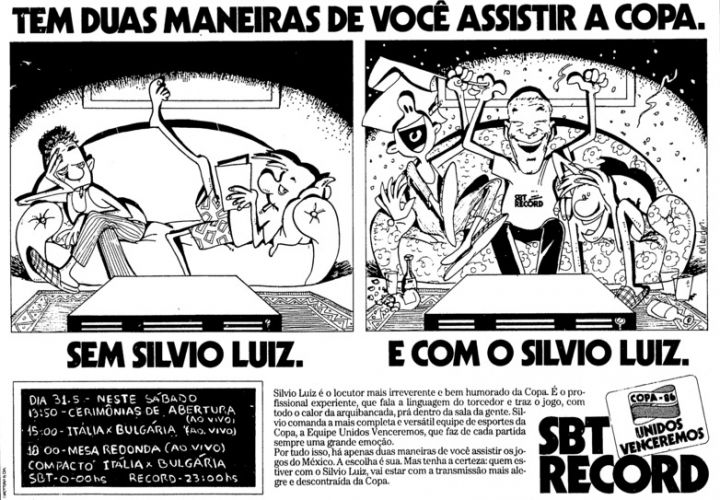 O SBT e a Record encomendaram charges ao cartunista Orlando Pedroso para incrementar as chamadas das transmissões publicadas nos jornais. As duas emissoras comemoraram os resultados da audiência. A Copa de 1986, vale lembrar, foi a primeira de Luciano do Valle na Bandeirantes. Ele montou uma grande equipe que virou referência. Nasceu o “Canal do Esporte”. Profissionais que trabalharam com ele na Globo migraram para Band, depois de uma rápida passagem pela TV Record. Luciano do Valle abriu espaço para ex-jogadores comentarem as partidas, como Pelé, Rivellino e Clodoaldo. Apesar do investimento da concorrência, o SBT e a Record marcaram época na transmissão da Copa de 1986, ficando em segundo lugar na audiência, atrás da Globo. Entretanto, a seleção, treinada por Telê Santana, não ajudou. A equipe foi eliminada nas quartas de final, em Guadalajara, pela França, em um jogo que só se resolveu nos pênaltis. A Argentina, de Maradona, foi campeã do mundo ao vencer a Alemanha, 3 a 2, no Estádio Azteca, o mesmo palco do tricampeonato do Brasil, em 1970.